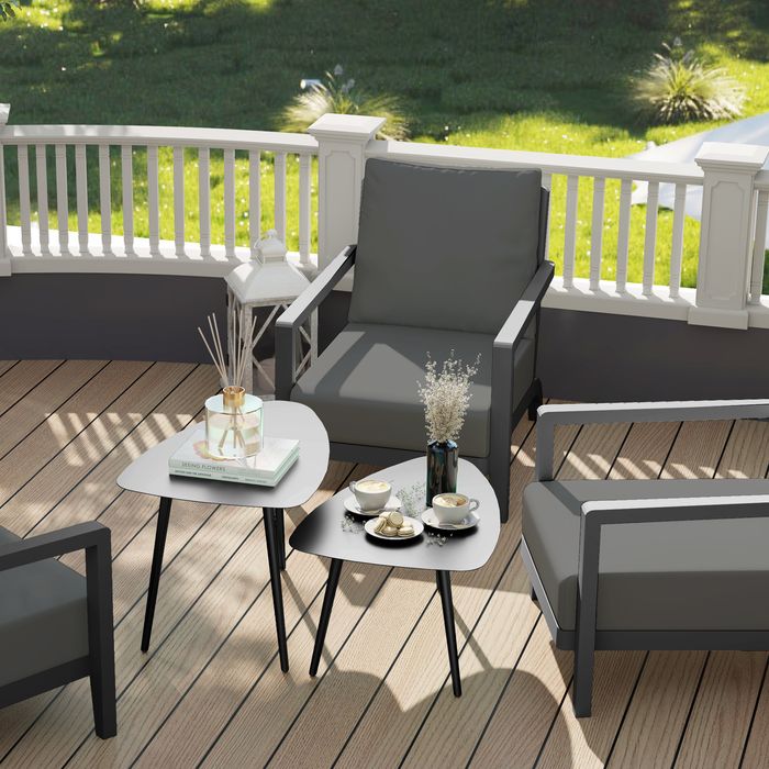 Gestalten Sie Ihren Wohnraum neu mit dem Outsunny Kaffeetisch Set. Dieses Set beinhaltet zwei stilvolle, ineinander greifende Garten-Beistelltische, die zusammen für eine dynamische Optik oder einzeln für flexible Nutzungsmöglichkeiten eingesetzt werden können. Dank verstellbarer Fusspads garantieren die Outdoor-Couchtische selbst auf unebenen Untergründen eine stabile Aufstellung, perfekt für jeden Raum.