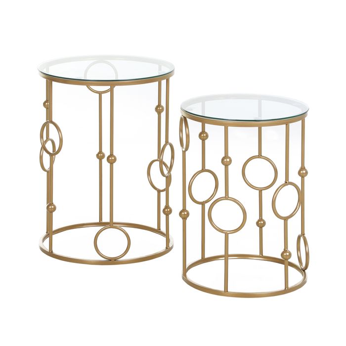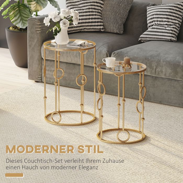 2er-Set Couchtisch, Beistelltisch mit Glasplatte, Reifen- und Kugeldesign Ø41 x 57 cm, Gold
