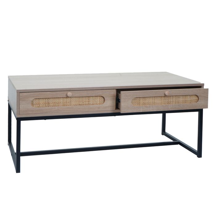 Couchtisch HWC-M41, Wohnzimmertisch Tisch Beistelltisch Sofatisch, Schublade, Kubu Rattan Holz Melamin, Eiche-Optik