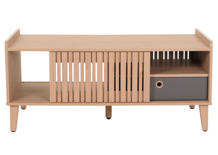 - Der Couchtisch verfügt über zwei geräumige Staufächer und eine Schublade, die es Ihnen leicht macht, alltägliche Gegenstände übersichtlich und geordnet zu verstauen.