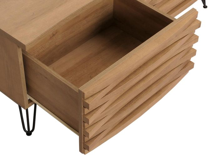 Ein besonderes Highlight ist die gewölbte Schubladenoberfläche, die dem Couchtisch ein stilvolles und einzigartiges Aussehen verleiht. Diese geschwungene Formgebung fügt eine dynamische Note hinzu und macht den Tisch zu einem echten Blickfang in Ihrem Wohnzimmer. Zusätzlich bietet der Tisch mit zwei grosszügigen Schubladen praktischen Stauraum für alles, was Sie im Wohnzimmer griffbereit haben möchten, von Fernbedienungen bis zu Zeitschriften. Jede Schublade trägt bis zu 8 kg, während die obere Platte mit einer maximalen Dauerbelastbarkeit von 39 kg ideal für dekorative Gegenstände, Bücher oder Ihre Kaffee- und Teetassen geeignet ist.
