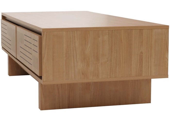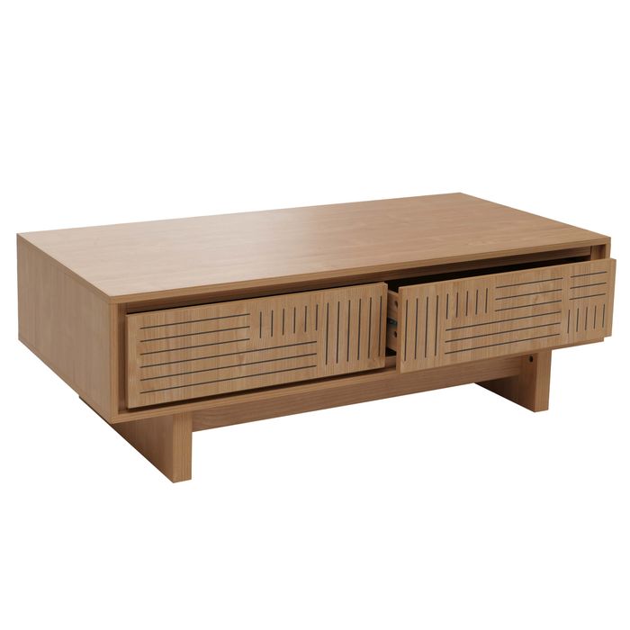 Der Couchtisch O33 vereint modernes Design mit durchdachter Funktionalität und ist die perfekte Ergänzung für jedes stilvolle Wohnzimmer. Seine robuste Tischplatte mit hochwertiger Melamin-Beschichtung überzeugt nicht nur optisch mit natürlicher Holzoptik, sondern bietet auch höchste Alltagstauglichkeit: Die Oberfläche ist besonders kratzfest und wasserabweisend - ideal für den täglichen Gebrauch und entspannte Abende mit Getränken oder Snacks. Zwei grosszügige Schubladen mit praktischer Push-to-Open-Funktion sorgen für ein aufgeräumtes Gesamtbild und lassen sich mühelos öffnen - ganz ohne Griff, nur mit leichtem Druck. Ergänzt wird der Stauraum durch zwei offene Fächer, die schnellen Zugriff auf Bücher, Fernbedienungen oder Zeitschriften ermöglichen. Die strukturierten Fronten setzen einen modernen Akzent und verleihen dem Tisch eine aussergewöhnliche, hochwertige Optik. Dank der integrierten Fussbodenschoner bleibt Ihr Boden frei von Kratzern, selbst bei häufigem Umstellen. Mit einer maximalen Dauerbelastbarkeit von 45 kg bietet die stabile Tischplatte ausreichend Fläche für Deko, Tablett oder Spieleabend – ganz ohne Kompromisse bei der Stabilität. Der Sofatisch ist mehr als nur ein Möbelstück - er ist ein stilvolles Statement mit funktionalem Mehrwert und lädt dazu ein, Wohnräume harmonisch und zugleich praktisch zu gestalten.