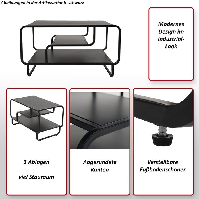- Moderner Couchtisch aus robustem Stahl mit aussergewöhnlichem Design, drei Ablagen für praktische Ordnung und abgerundeten Kanten für mehr Sicherheit – ideal für stilbewusste Haushalte mit Sinn für Funktionalität.