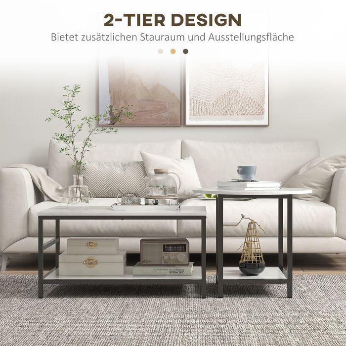 - Set aus zwei Tischen: Diese stilvolle Couchtische bestehen aus einem rechteckigen und einem runden Tisch, die sowohl separat als auch zusammen verwendet werden können. Die Tischplatten in edler Marmoroptik und das schwarze Stahlgestell verleihen jedem Raum eine elegante Note.