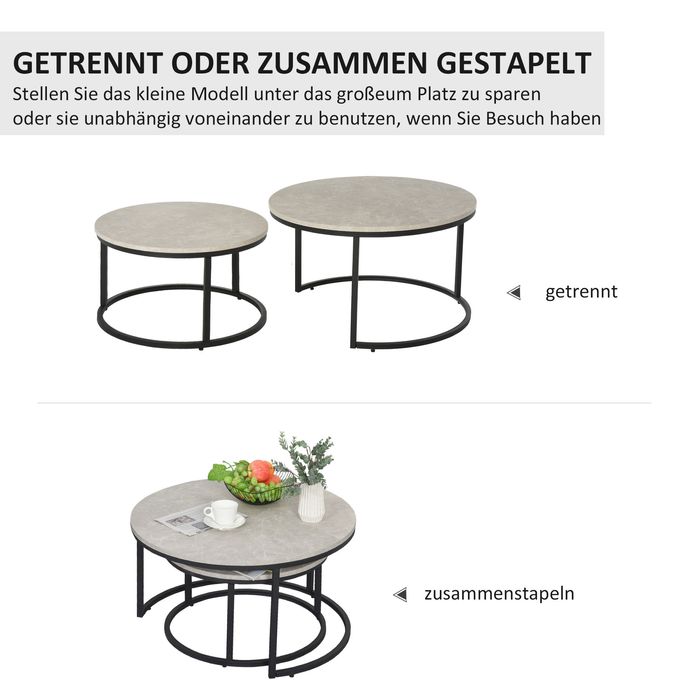- Zwei Rundtische: Enthält einen grossen (78,5L x 78,5B x 46,5H cm) und einen kleinen (59L x 59B x 36,5H cm) runden Couchtisch, ideal für vielseitige Anordnungen in Wohnzimmern, Schlafzimmern, Home Offices und kleinen Räumen.
