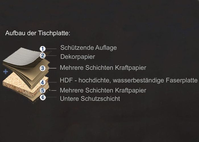 Tischplatte: HDF (hochdichte Faserplatte), HPL* Laminat, Melamin beschichtet