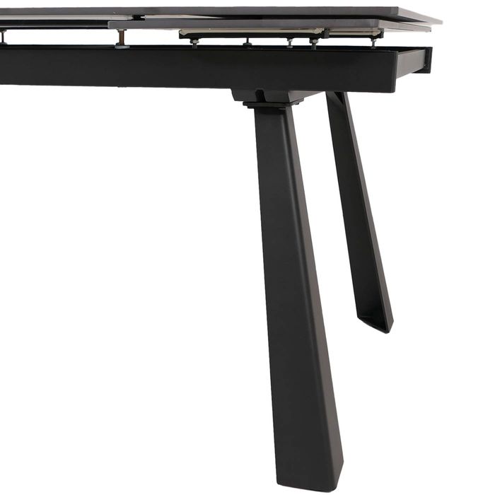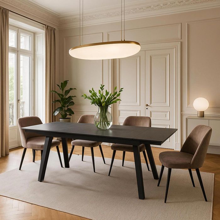 Der Esszimmertisch O59 vereint modernes Design mit höchster Funktionalität und wird schnell zum Mittelpunkt Ihres Zuhauses. Die ausziehbare Tischplatte aus edlem Sinterstein überzeugt durch ihre strukturierte Oberfläche, die dem Tisch eine exklusive und natürliche Ausstrahlung verleiht. Das innovative Material ist besonders langlebig, kratzfest und unempfindlich gegenüber hohen Temperaturen, sodass Sie lange Freude an diesem Möbelstück haben werden. Dank der leichtgängigen Ausziehfunktion lässt sich der Tisch im Handumdrehen auf eine grosszügige Länge von bis zu 242 cm erweitern, wodurch er Platz für bis zu zehn Personen bietet. So können Sie Familie und Freunde ganz entspannt bewirten, ohne Kompromisse beim Komfort eingehen zu müssen. Das stabile Gestell sorgt für höchste Standfestigkeit, während die abgerundeten Ecken für eine harmonische Optik und zusätzliche Sicherheit sorgen.