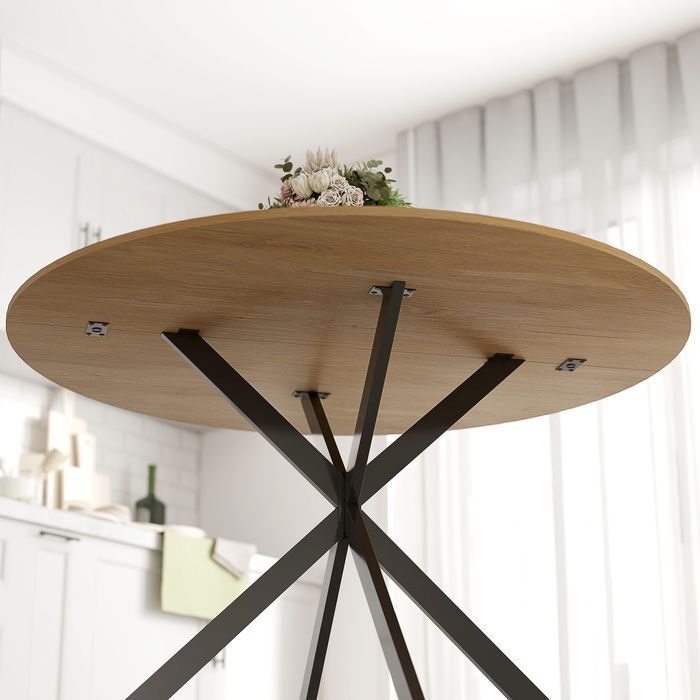 Dieser runde Esstisch verfügt über eine Oberfläche in Holzoptik und die auffälligen X-Beine bieten eine perfekte Mischung aus Gemütlichkeit und Stil. Der Küchentisch für vier Personen eignet sich hervorragend für einen entspannten Brunch, muntere Spieleabende oder ein Dinner bei Kerzenschein. Dank verstellbarer Fusspads bleibt er auch auf unebenen Böden stabil.