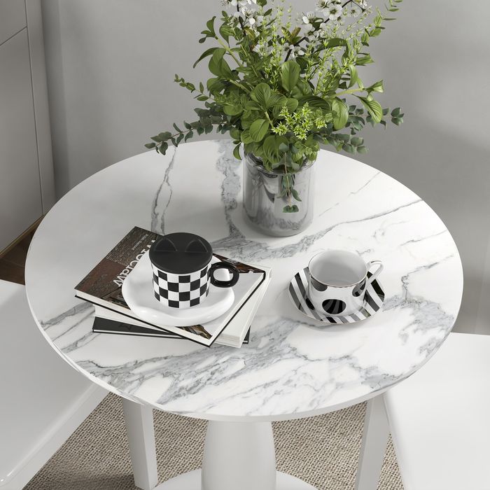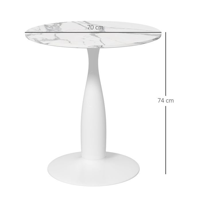 Geniessen Sie entspannte und stilvolle Mahlzeiten mit dem HOMCOM Esszimmertisch. Seine elegante, runde Form und die kunstmarmorierte Oberfläche des Küchentisches verleihen ihm eine klassische Ausstrahlung. Der Rahmen des Küchentisches aus pulverbeschichtetem Stahl bietet eine solide Basis, ergänzt durch rutschfeste Fusspolster für zusätzliche Stabilität. Ideal für gesellige Stunden, egal wo.