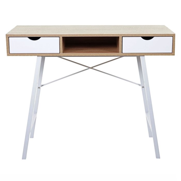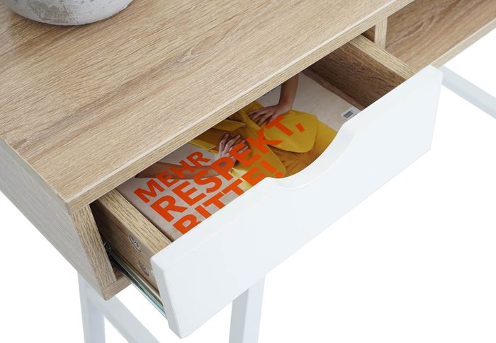 Dieser Konsolentisch ist in seinem schlichten und funktionalen Erscheinungsbild ideal als Ergänzung in Ihrem Büro oder Wohnzimmer. Dank der Schubladen und des Ablagesfachs bietet er genug Stauraum um Ordnung zu schaffen. Durch das zeitlose und moderne Design fügt sich dieses Möbelstück dekorativ in fast jedes Ambiente ein und setzt einen eleganten Akzent in Ihr Zuhause.
