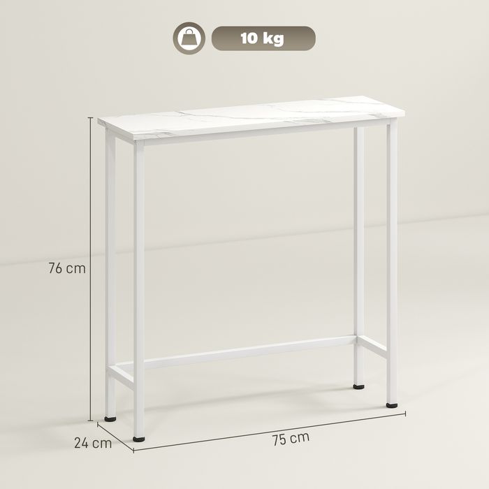 Verleihen Sie Ihrem Heim einen Hauch von Eleganz mit dem schmalen HOMCOM Konsolentisch, ausgestattet mit einer edlen Marmoroptik-Tischplatte, die sich perfekt in Flur oder Wohnzimmer einfügt. Dank der schlanken 24 cm Tiefe, fügt der Konsolentisch sich ideal in kleine Räume ein, und die verstellbaren Fusspads sorgen für Stabilität auf unebenem Untergrund. Eine stilvolle und praktische Bereicherung Ihrer Einrichtung.