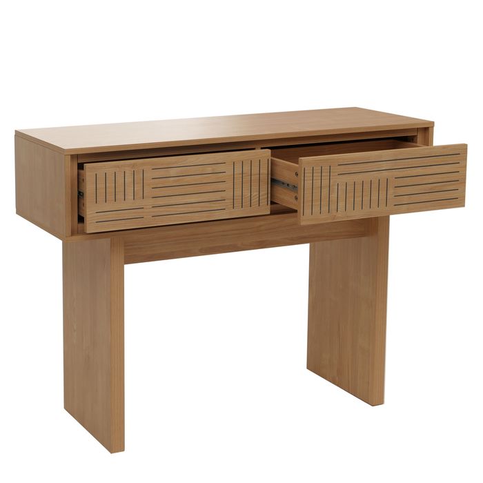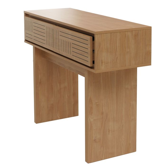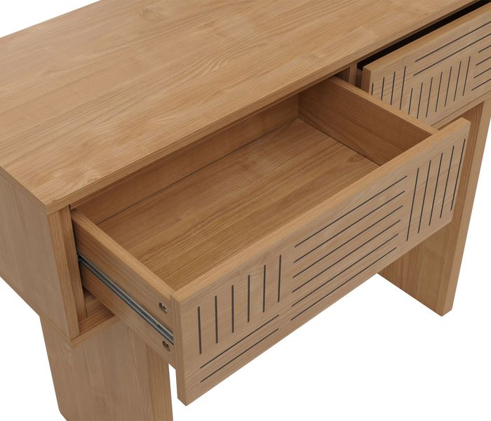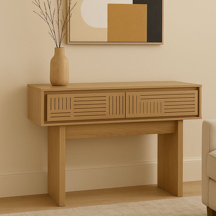 Der Konsolentisch O31 verbindet stilvolles Design mit hoher Funktionalität und ist die ideale Ergänzung für Flur, Wohnzimmer oder Arbeitsbereich. Mit seinem modernen Look und den strukturierten Fronten bringt er wohnliche Eleganz in jeden Raum. Die hochwertige Melamin-Beschichtung verleiht dem Tisch nicht nur eine edle Optik, sondern macht ihn besonders widerstandsfähig gegenüber Kratzern und Feuchtigkeit – perfekt für den täglichen Gebrauch. Zwei grosszügige Schubladen mit praktischem Push-to-open-Mechanismus bieten reichlich Platz für Schlüssel, Notizblöcke oder andere Alltagsgegenstände, die ordentlich verstaut werden sollen.