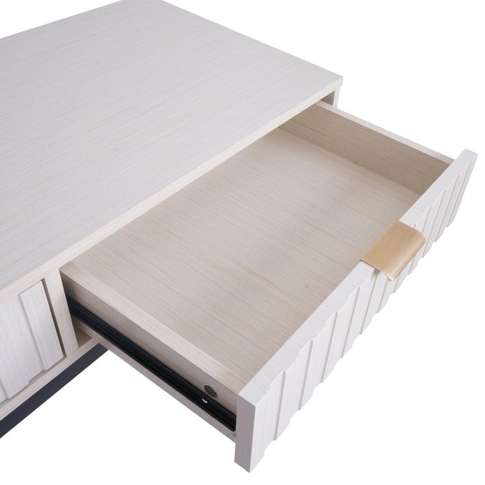 Die strukturierten Schubladenfronten verleihen dem Tisch eine besondere Tiefe und unterstreichen den modernen Charakter des Möbels. Seine klare Formensprache passt sich mühelos verschiedenen Einrichtungsstilen an – von minimalistisch bis zeitlos elegant. Durch die stabile Verarbeitung und die pflegeleichte Oberfläche bleibt der Tisch auch langfristig ein funktionaler und optischer Gewinn für jeden Raum. Perfekt für alle, die Design, Qualität und Alltagstauglichkeit in einem Möbelstück vereint wissen möchten. Bitte beachten Sie: Die abgebildete Dekoration ist nicht im Lieferumfang enthalten.
