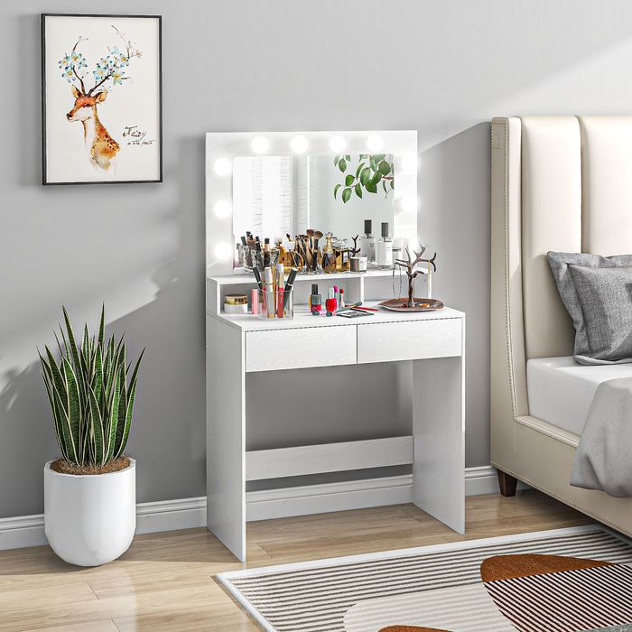 Gestalten Sie Ihre Beauty-Routine neu – mit dem HOMCOM Frisiertisch! Der Schminktisch ist mit einem grossen Spiegel und 10 Hollywood-Lampen ausgestattet und bietet dreifach verstellbare Lichtoptionen für jede Tageszeit. Die grosszügige Tischplatte, zwei Schubladen und drei Fächer des Schminktisches bieten reichlich Stauraum und das elegante nordische Design bereichert jedes Zimmer.
