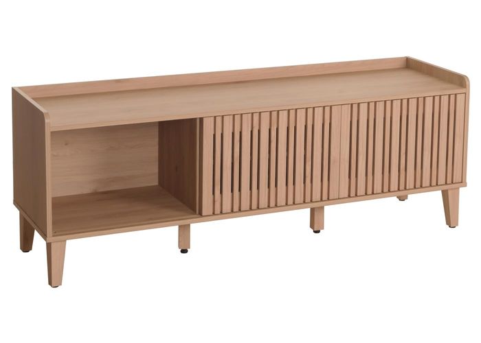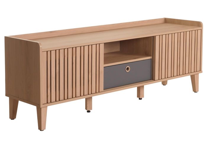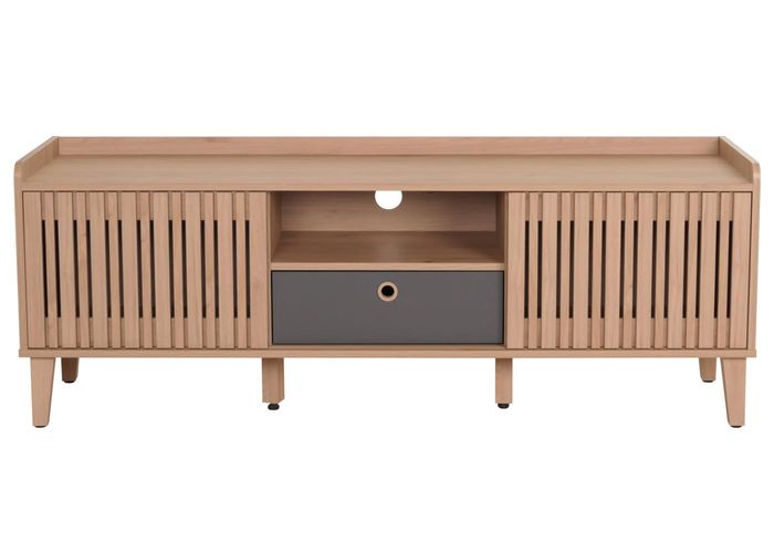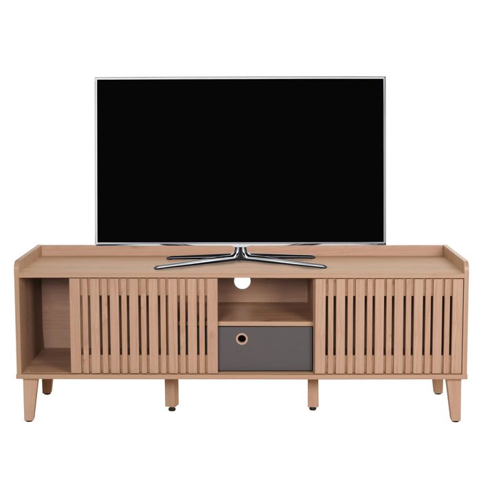 - Entdecken Sie das perfekte TV-Rack mit zwei Schiebetüren auf einem Rollenschienensystem für mühelosen Zugang zu Ihrem Entertainment-Equipment, kombiniert mit einer geräumigen Schublade und drei grosszügigen Ablagefächern.
