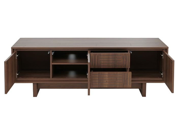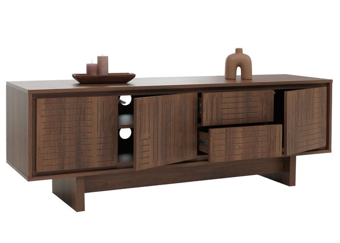Das TV-Rack O34 vereint stilvolles Design mit  funktionaler Raffinesse und ist die perfekte Lösung für ein modernes Wohnzimmer  mit klaren Linien. Die strukturierten Fronten verleihen dem Lowboard eine  elegante, hochwertige Optik, die sich mühelos in verschiedenste  Einrichtungsstile integrieren lässt. Hinter drei Türen und in zwei praktischen  Schubladen bietet der TV-Schrank reichlich Stauraum für Multimedia-Geräte,  Fernbedienungen, Kabel und alles, was im Wohnzimmer schnell für Unordnung sorgt.  Die Push Tu Open Funktion der Schubladen sorgt für eine grifflose, besonders  moderne Optik und ermöglicht gleichzeitig ein komfortables Öffnen per leichtem  Druck - ganz ohne störende Griffe.
