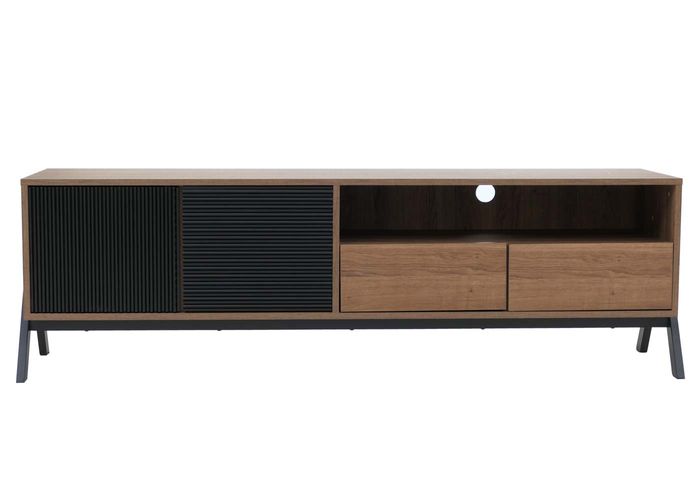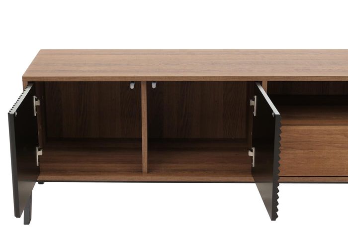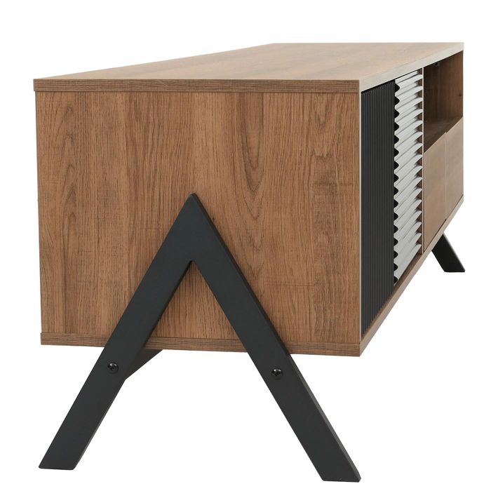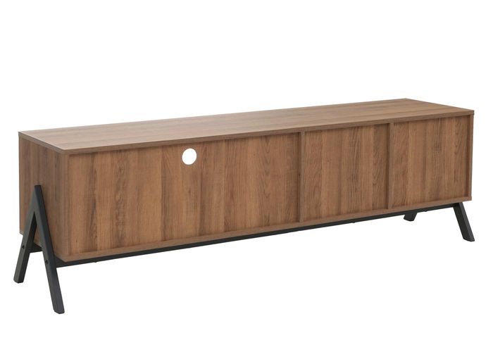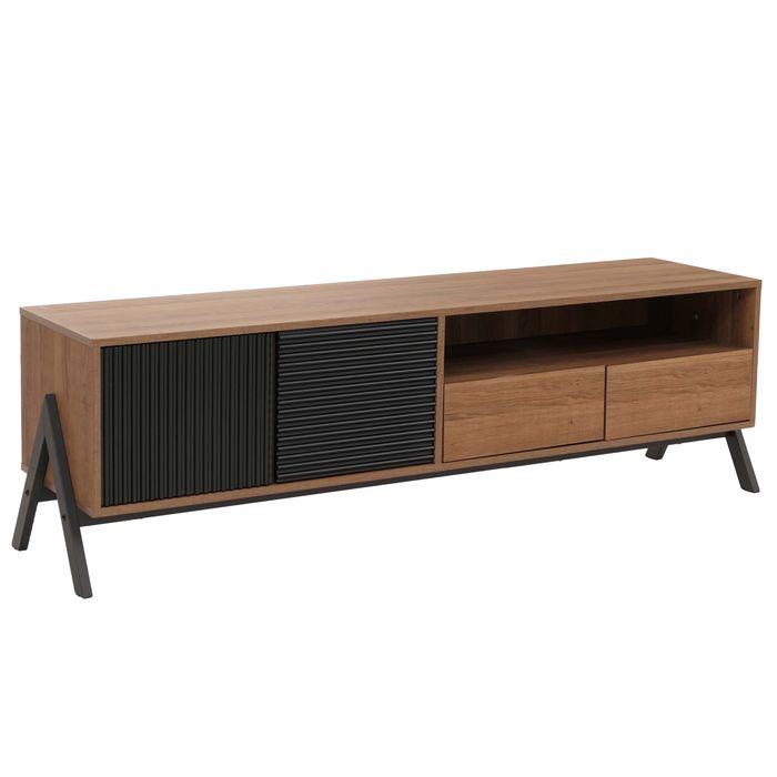 Das TV-Rack O40 vereint modernes  Design mit praktischer Funktionalität und wird so zum Highlight in jedem  Wohnzimmer. Die hochwertige Oberfläche mit robuster Melamin-Beschichtung macht  das Möbelstück besonders kratzfest und wasserabweisend, sodass es selbst im  Alltag lange wie neu aussieht. Mit grosszügigem Stauraum überzeugt das TV-Rack  durch drei Ablagefächer und zwei leichtgängige Schubladen, die zusätzlichen  Platz für alles bieten, was ordentlich verstaut werden soll. Kabel gehören dank  des integrierten Kabeldurchlasses auf der Rückseite der Vergangenheit an, sodass  der Look stets aufgeräumt und stilvoll bleibt. Das moderne V-Fuss-Gestell aus  stabilem Metall verleiht dem Möbelstück nicht nur einen trendigen  Industrial-Charakter, sondern sorgt auch für einen sicheren Stand. Durch die  integrierten Fussbodenschoner bleibt Ihr Boden optimal geschützt.