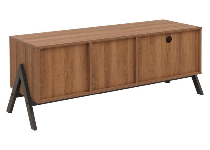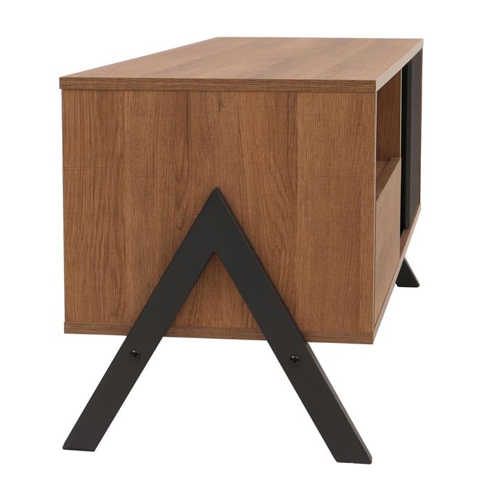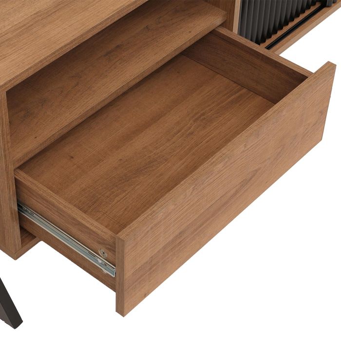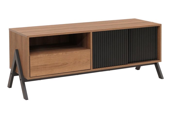 Das TV-Rack O40 vereint modernes  Design mit praktischer Funktionalität und wird so zum Highlight in jedem  Wohnzimmer. Die hochwertige Oberfläche mit robuster Melamin-Beschichtung macht  das Möbelstück besonders kratzfest und wasserabweisend, sodass es selbst im  Alltag lange wie neu aussieht. Mit grosszügigem Stauraum überzeugt das TV-Rack  durch drei offene Ablagefächer, eine leichtgängige Schublade sowie eine  strukturierte Schiebetür, die zusätzlichen Platz für alles bietet, was  ordentlich verstaut werden soll. Kabel gehören dank des integrierten  Kabeldurchlasses auf der Rückseite der Vergangenheit an, sodass der Look stets  aufgeräumt und stilvoll bleibt. Das moderne V-Fuss-Gestell aus stabilem Metall  verleiht dem Möbelstück nicht nur einen trendigen Industrial-Charakter, sondern  sorgt auch für einen sicheren Stand. Durch die integrierten Fussbodenschoner  bleibt Ihr Boden optimal geschützt.