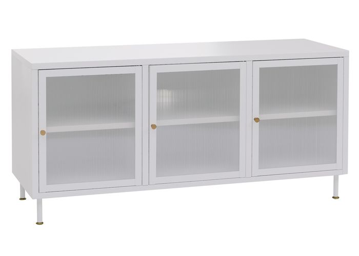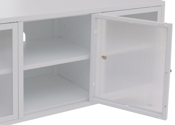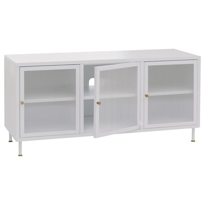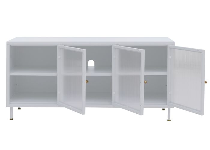 - Schlichtes Industrial-Design, halbtransparente Schilfglastüren und goldfarbene Akzente machen dieses robuste Metall-TV-Rack O87 zum stilvollen Blickfang. Sechs Ablagefächer bieten grosszügigen Stauraum, inklusive Kabelloch für saubere Kabelordnung.