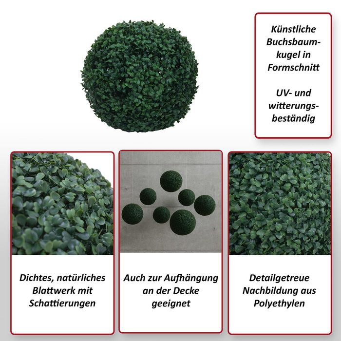 - Die künstliche Buchsbaumkugel im Formschnitt überzeugt durch detailgetreues, dichtes Blattwerk mit natürlichen Schattierungen. Aus robustem Polyethylen gefertigt, ist sie UV- und witterungsbeständig und eignet sich für den Innen- und Aussenbereich.