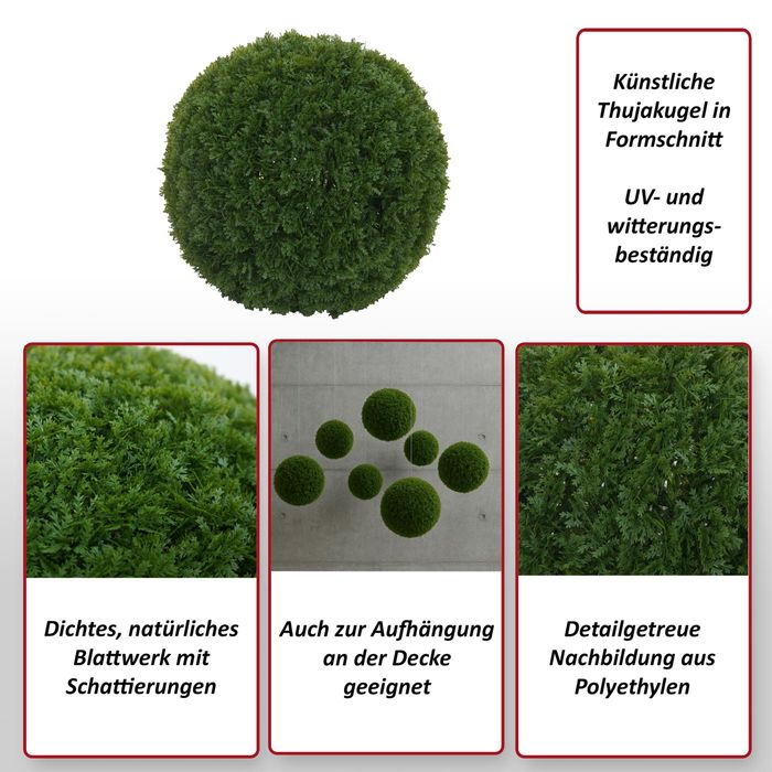 - Die künstliche Thujakugel im Formschnitt überzeugt mit detailgetreuem, dichtem Blattwerk und natürlichen Schattierungen. Aus hochwertigem Polyethylen gefertigt, ist sie UV- und witterungsbeständig und eignet sich ideal für Innen- und Aussenbereiche.