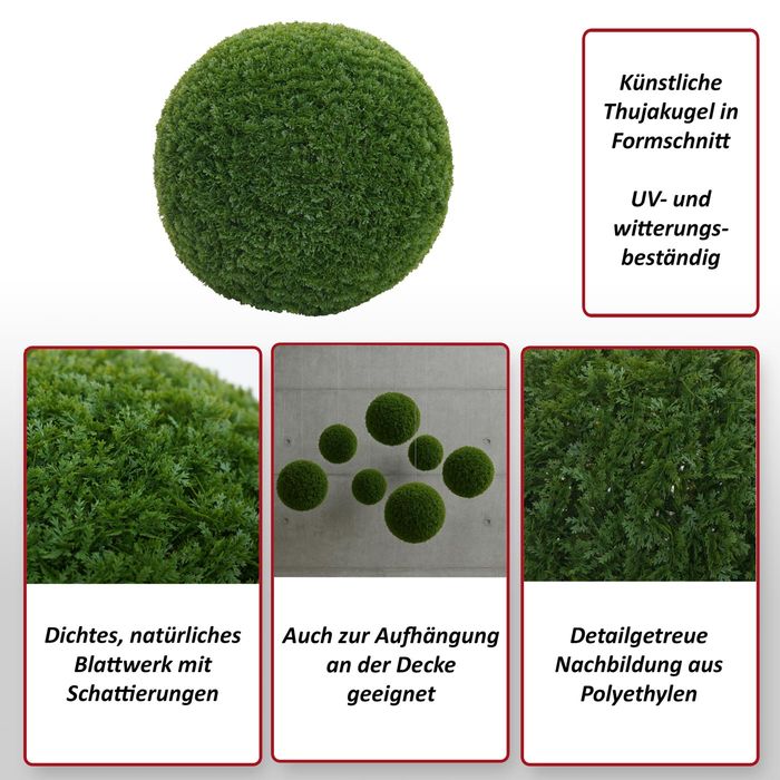 - Die künstliche Thujakugel im Formschnitt überzeugt mit detailgetreuem, dichtem Blattwerk und natürlichen Schattierungen. Aus hochwertigem Polyethylen gefertigt, ist sie UV- und witterungsbeständig und eignet sich ideal für Innen- und Aussenbereiche.