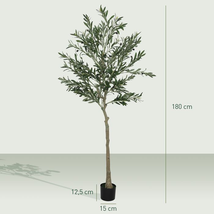 Gestalten Sie Ihren Bereich neu mit dem künstlichen Olivenbaum von HOMCOM, der echtes Grün täuschend realistisch imitiert. Jede Kunstpflanze im Topf präsentiert sich mit dichten Blättern und seidenartigen Oliven für einen natürlichen Look. Formen Sie den Baum dank biegsamer Zweige nach Ihrem Wunsch, fest verankert in einem robusten, zementgefüllten Topf. Erleben Sie dauerhaftes Grün ohne Pflegeaufwand und werten Sie Ihr Zuhause oder Ihr Büro stilvoll auf.
