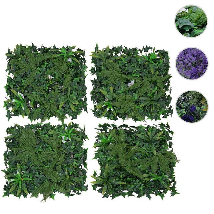 Wandpaneel HWC-O95, Pflanzenwand Kunstpflanze, In-/Outdoor, 4x je 50x50cm = 1m² – Farn/Efeu