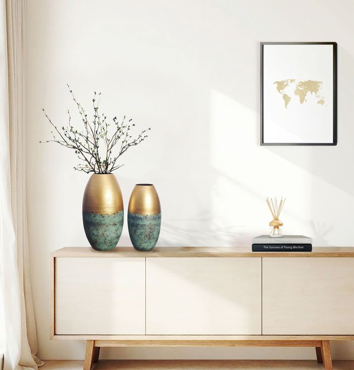2er Set Vase Aluminium Gold Patina Blumenvase Tischvase Punziert Rund