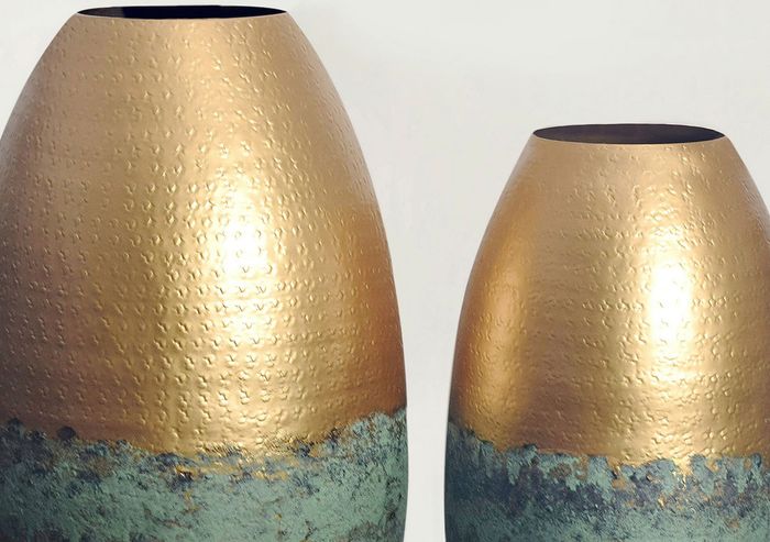 - Beide Blumenvasen: massives Aluminium, gold bzw. patinafarben lackiert