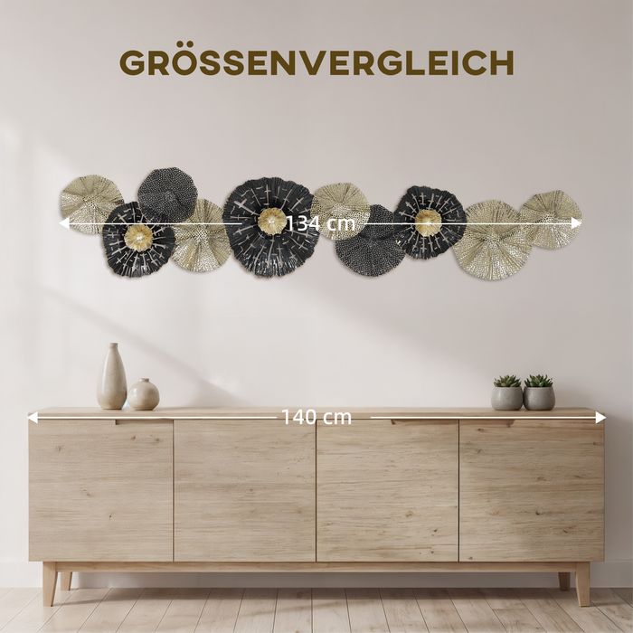 - Modern künstlerischer Touch: Dieses Metall Wanddeko besticht durch eine elegante Kombination aus hellgoldenen und schwarzen Tönen sowie unregelmässigen kreisförmigen Scheiben, die Ihrem Raum eine moderne Eleganz verleihen. Das schlanke, lineare Design erzeugt einen auffälligen Mittelpunkt, der jede Wohnatmosphäre bereichert.