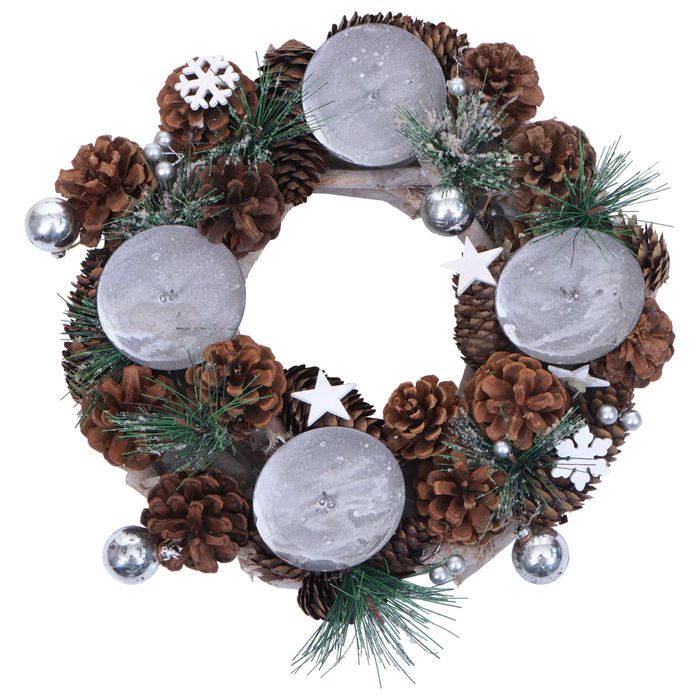 - Dieser Adventskranz mit Kerzenhaltern ist die perfekte Weihnachtsdekoration für die festliche Jahreszeit. Hergestellt aus natürlichen Materialien im Silber-Look und langlebiger Grün-Dekoration, strahlt es einen warmen, gemütlichen Charme aus.