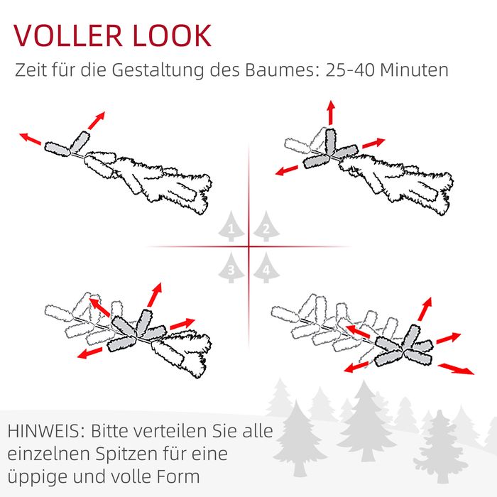 - Informationen zum künstlichen Weihnachtsbaum: Dekorationsornamente sind NICHT enthalten und nur zu Anschauungszwecken gezeigt. Für ein vollständiges, dichtes Erscheinungsbild breiten Sie bitte alle Zweigspitzen aus.