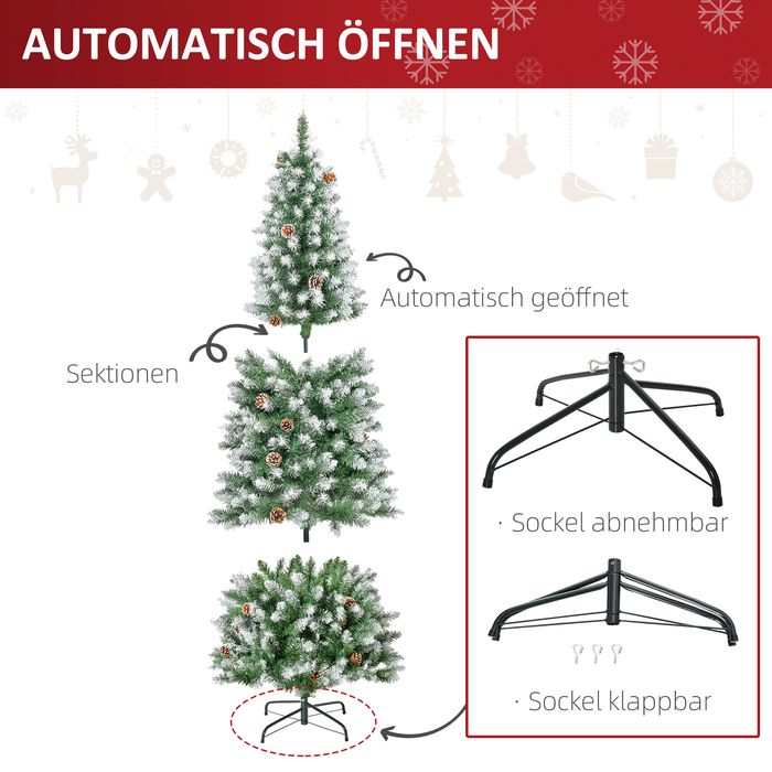 Haben Sie schon oft überlegt, einen echten künstlichen Weihnachtsbaum zu kaufen, weil künstliche Bäume oft unrealistisch wirken? Dann sind Sie hier genau richtig! Der künstliche Weihnachtsbaum von HOMCOM vereint die Schönheit eines natürlichen Baums mit schneebedeckten Zweigen und dekorativen Zapfen. Dank der stabilen Metallstruktur des künstlichen Weihnachtsbaums lässt er sich leicht auf- und abbauen. Zögern Sie nicht länger und bringen Sie festliche Magie in Ihr Zuhause!