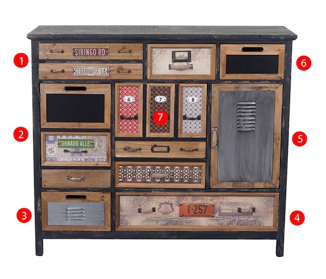 - 9 individuell verzierte Schubladen und 3 offene Staufaecher
