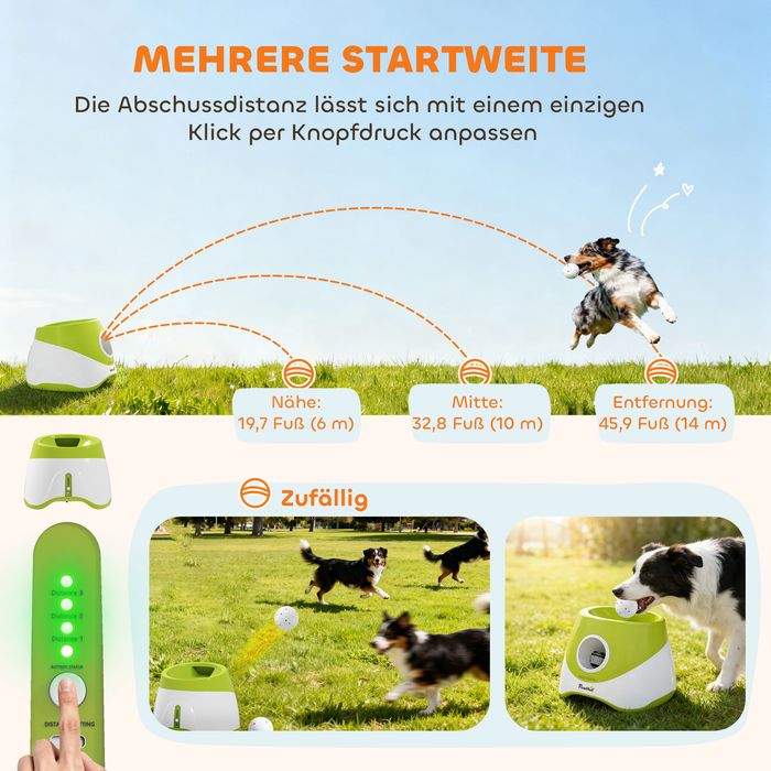 - Einstellbare Wurfmodi: Drei Wurfdistanzen (6 m, 10 m, 14 m) und Zufallsmodus bieten anpassbare Spielintensität für Räume und Hunde, sodass Sie Apportiersessions kontrollieren können.
