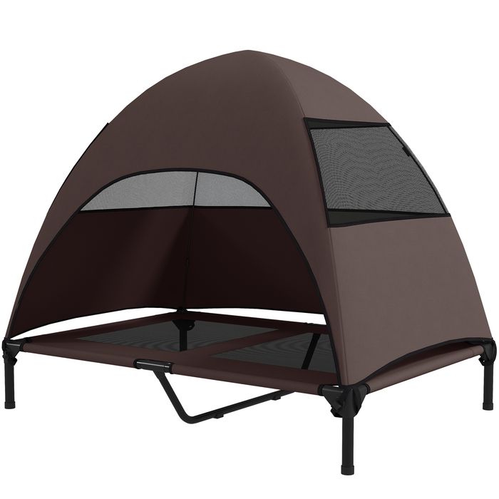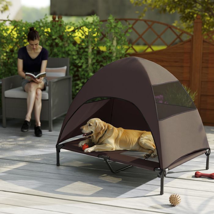 Hundeliege Outdoor mit Dach, Erhöhtes Hundebett für Grosse Hunde, 106 x 76 x 99 cm, Kaffee