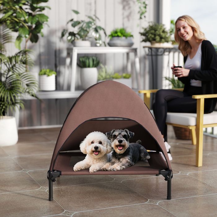 Hundeliege Outdoor mit Dach, Erhöhtes Hundebett für Mittelgrosse Hunde, 76 x 61 x 71cm, Kaffee