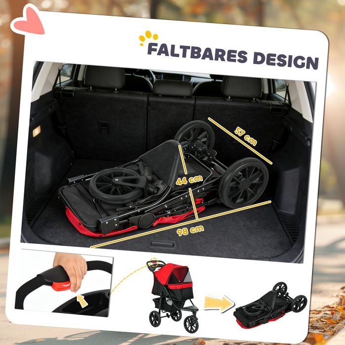 Hundebuggy, klappbar bis 10kg mit 3 Rädern, 109,5x57,5x106,5cm Rot
