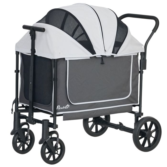 Erleben Sie gemeinsame Outdoor-Abenteuer mit dem PawHut Hundewagen! Einfach zu schieben oder zu ziehen, bietet der Hundebuggy grossen Hunden bis 30 kg und einer Körperlänge bis 60 cm einen komfortablen Platz. Dank des leicht klappbaren Designs lässt der Katzenwagen sich problemlos verstauen und ist aus robustem Stahl sowie strapazierfähigem 600D Oxford-Stoff gefertigt.