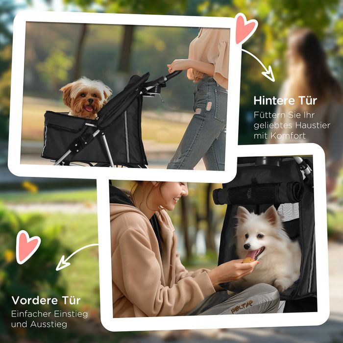 - Einfacher Zugang: Dank der Reissverschlüsse können Sie Ihr Haustier auf zwei Arten in den Hundewagen ein- und aussteigen lassen.