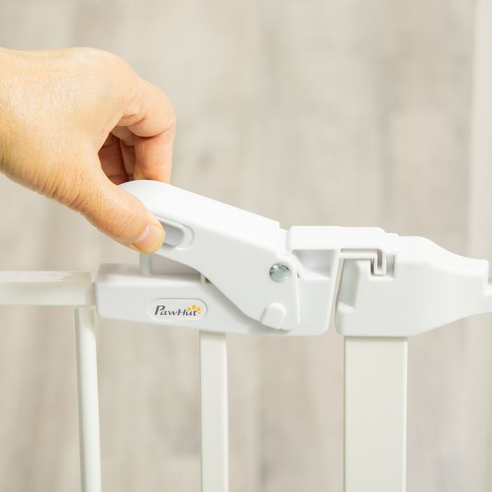 - Doppelverriegelungssystem: Erwachsene können die Tür mit einer Hand öffnen, indem sie den Knopf an der Oberseite schieben (Sie müssen beide Enden gleichzeitig schieben und dann anheben). Ziehen Sie den Knopf an der Falte fest, um die Tür zu fixieren. Es gibt ein oberes und ein unteres Schloss für an dem Tor des Gitters.
