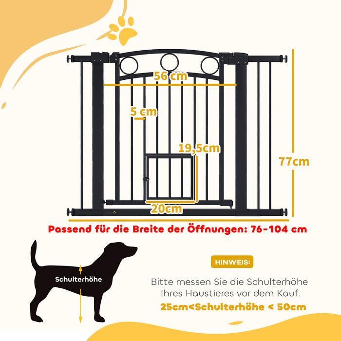 Entdecken Sie das PawHut Treppenschutzgitter für Hunde: eine flexible Lösung, um Ihre Tiere sicher zu halten. Dieses hohe und breite Treppenschutzgitter passt sich von 76 bis 104 cm an, ideal für verschiedene Bereiche. Mit seinem Doppelschliesssystem und der praktischen Katzentür ist dieses Treppenschutzgitter perfekt für Haushalte mit mehreren Haustieren geeignet. Sowohl stilvoll als auch praktisch – ein unverzichtbares Accessoire für jeden Haustierbesitzer.