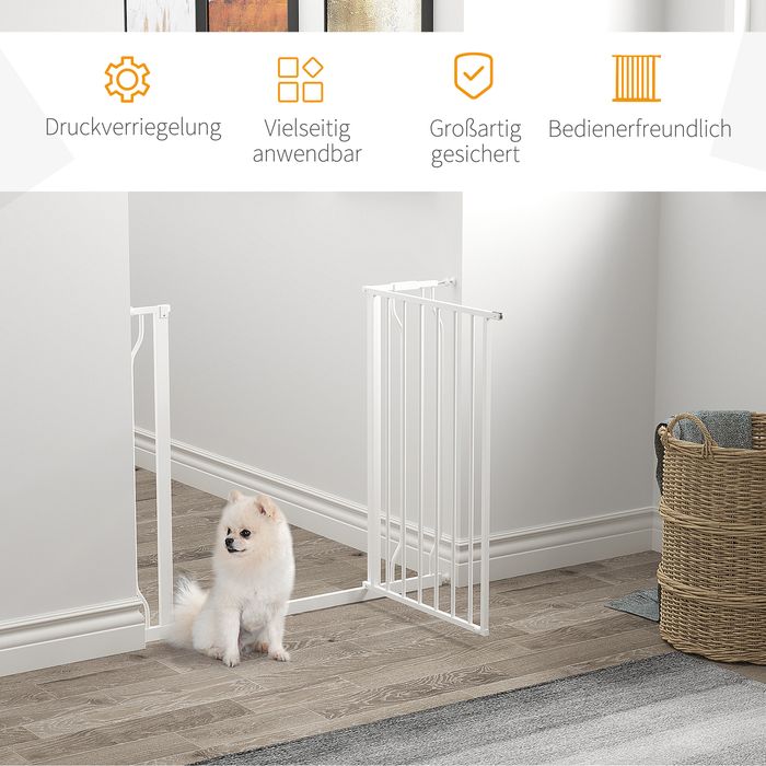 Mit diesem Schutzgitter können Sie Ihrem Haustier ein Höchstmass an Sicherheit bieten. Hergestellt aus stabilem Metall und ABS-Kunststoff für viel Stabilität. Mithilfe einer Verlängerung können Sie es problemlos in verschiedenen Abständen (75 cm bis 95 cm) aufstellen. Mit einem Schiebegriff und zwei drehbaren Verriegelungen ist es leicht zu öffnen. Der doppelte Verriegelungsmechanismus sorgt dafür, dass Ihr Haustier sicher und geschützt ist.