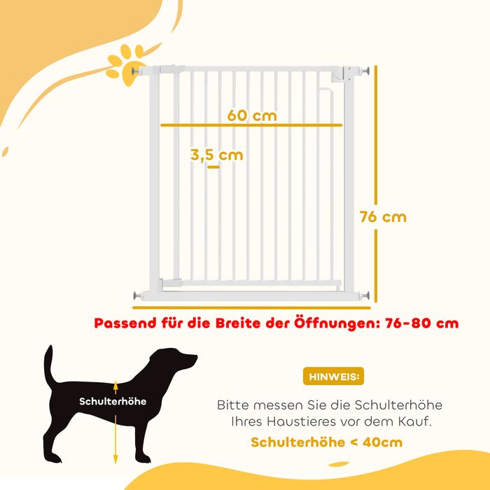 - Sicherheitsgitter für Babys und Haustiere: Dieses nach ASTM, SOR2016-179, EN1930:2011 und EN71-3 geprüfte Türschutzgitter passt in Öffnungen mit einem Durchmesser von 76–80 cm und einer Höhe von 76 cm. Es hält Babys im Alter von 6 bis 24 Monaten und kleine bis mittelgrosse Hunde sicher im Haus. Ideal für Treppen, Türen, Flure.