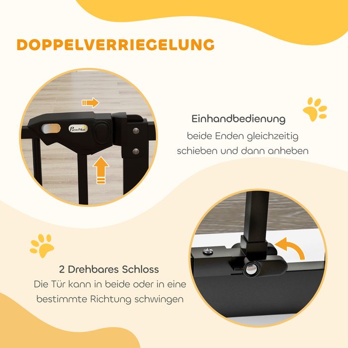 Dieses PawHut Haustiergitter eignet sich hervorragend, um Ihre Haustiere in Räumen zu halten, indem Sie es vor der Tür verwenden, um die Haustiere drinnen zu halten. Es ist auch ein grossartiger Sicherheitsartikel, wenn Sie Ihre Haustiere von Kindern im Haus trennen möchten. Das Gitter ist aus behandeltem Eisen gefertigt, um Stabilität und Langlebigkeit zu gewährleiste. Das Gitter ist mit Verlängerungen und Einstellschrauben ausgestattet.