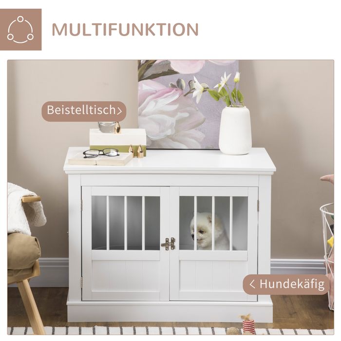 - Geräumige Tischplatte: Dieser Hundekäfig bietet eine grosszügige Oberfläche für alles, von Getränken bis zu Fernbedienungen und Speisen. Geniessen Sie die Kombination aus Fernsehtisch und Hundehütte, die Platz spart.