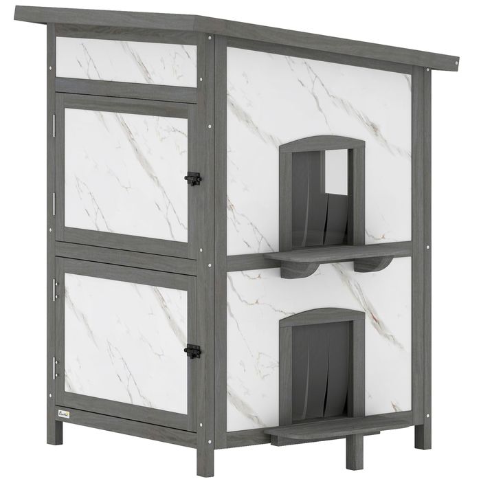 Schaffen Sie einen warmen und geschützten Aussenbereich für Ihre Katze mit diesem doppelstöckigen Katzenhaus. Die Aluminiumisolierung sorgt ganzjährig für Gemütlichkeit. Das wasserdichte Dach, die Plastikklappen und der erhöhte Boden schützen effektiv vor Nässe und Wind. Aus Massivholz gefertigt und mit zwei aufklappbaren Türen ausgestattet, trägt dieses Outdoor Katzenhaus bis zu 5 kg und eignet sich ideal für Freigänger oder streunende Katzen.