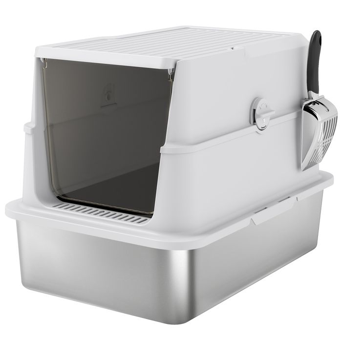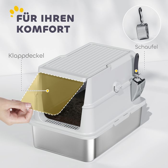 Katzentoilette, Edelstahl, XL-Innenraum, mit Schaufel, Hellgrau