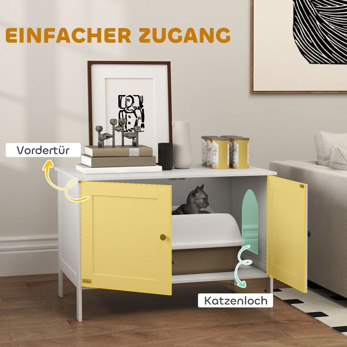 - Geruchsminimierendes Design: Die umschliessende Konstruktion verdeckt die Katzentoilette, bewahrt eine ansprechende Optik und kontrolliert effektiv unerwünschte Gerüche.